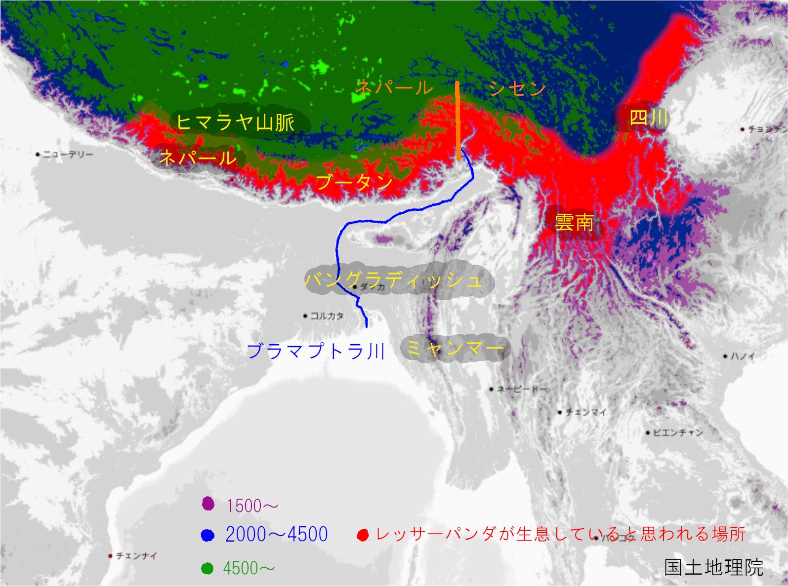 げん こぐまねこびいき 国土地理院の地図 だと標高で色分けできるので1500 紫 00 4500が青 それ以上が緑 青のうちで赤パンダがいそうな場所を赤で塗るとこんな感じだった ヒマラヤから北ってあんなに4500以上のところばかりだったのか なんで分布が